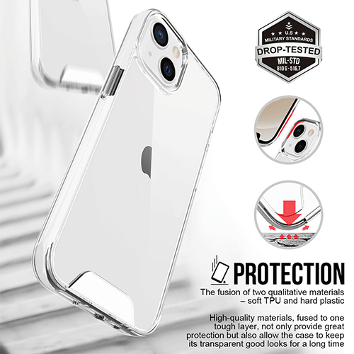 Fabriqué à partir d'un mélange de polycarbonate optiquement transparent et de matériaux TPU flexibles. Mince, léger et facile à saisir, l'étui de téléphone transparent anti-chute est conçu pour protéger votre iPhone des rayures et des chutes.